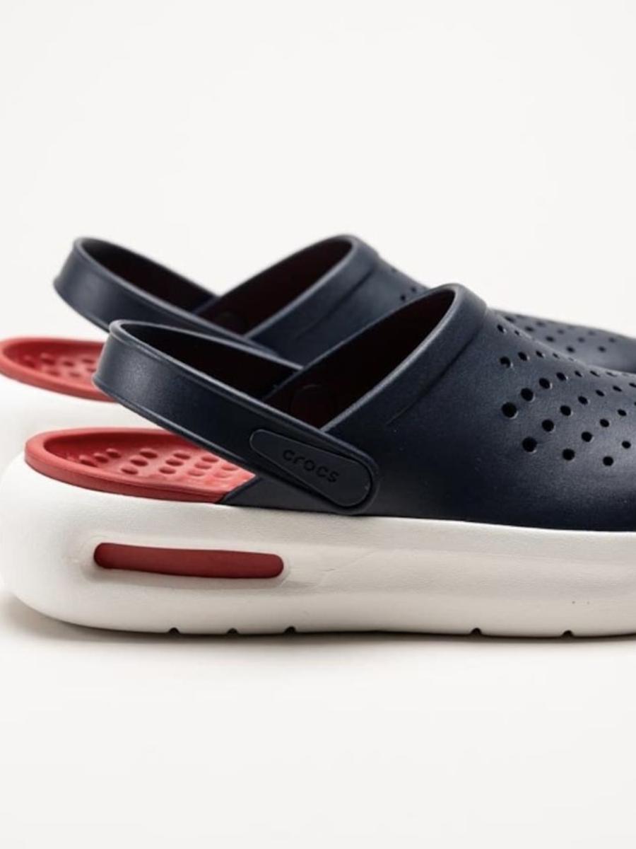 pair of unadorned, Classic Clogs displayed on a light wooden countertop within a retail environment. One shoe is upright, highlighting the smooth texture and signature toe vents, while the second is on its side, revealing the substantial tread pattern on the sole. The clear...- Rs. 1,599.00